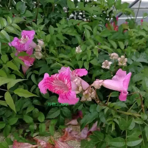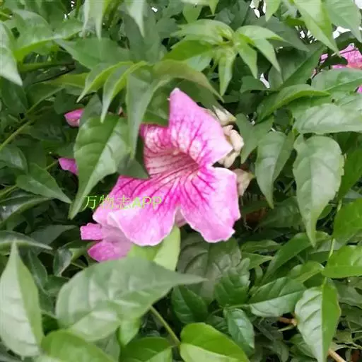 常绿半蔓性灌木,自然独立生长状态下,高1米左右,少数达到2米。叶对生,奇数羽状复叶,叶柄具凹沟,小叶通常11枚,也有9枚或13枚。小叶长卵形,长4-6厘米,先端尖,叶缘具锯齿,叶柄基部紫黑色。花期秋至翌茸春季,圆锥花序顶生,花冠漏斗状钟形,先端5裂,粉红到紫红色,喉部色深,有时带有紫红色脉纹。