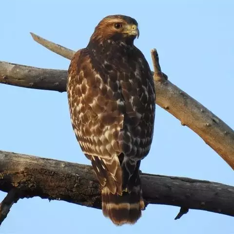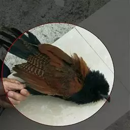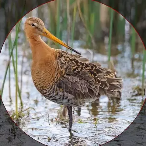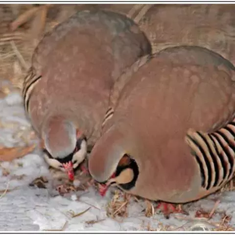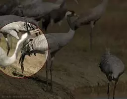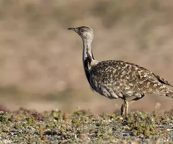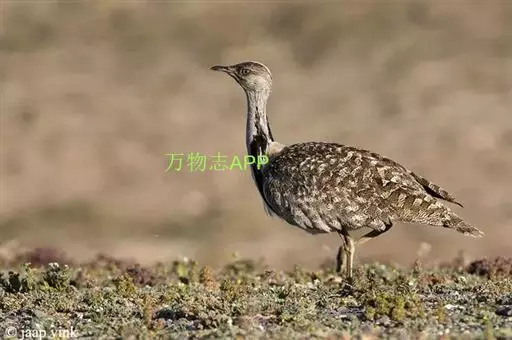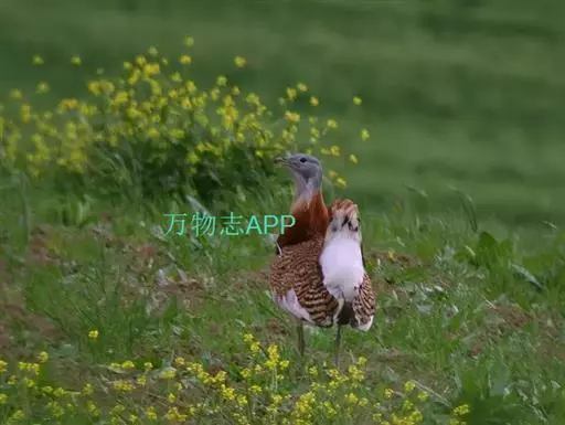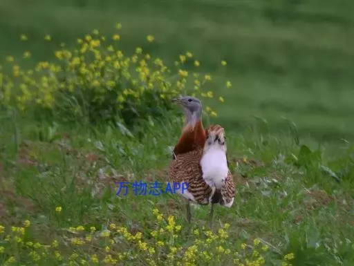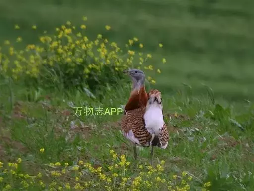 大鸨 大鸨成鸟两性体形和羽色相似,但雌鸟较小。繁殖期的雄鸟前颈及上胸呈蓝灰色,头顶中央从嘴基到枕部有一黑褐色纵纹,颏、喉及嘴角有细长的白色纤羽,在喉侧向外突出如须,长达10~12厘米。颏和上喉灰白色沾淡锈色。后颈基部栗棕色,上体栗棕色满布黑色粗横斑和黑色虫蠹状细横斑。初级飞羽和次级飞羽黑褐色,具白色羽基;大覆羽和大部分三级飞羽白色,中覆羽和小覆羽灰色,具白色端斑。前胸两侧具宽阔的栗棕色横带,下体余部白色。中央尾羽栗棕色,先端白色,具稀疏黑色横斑;尾羽的白色部分向两侧依次扩展,最外侧尾羽几乎全为纯白色,仅具黑色端斑。