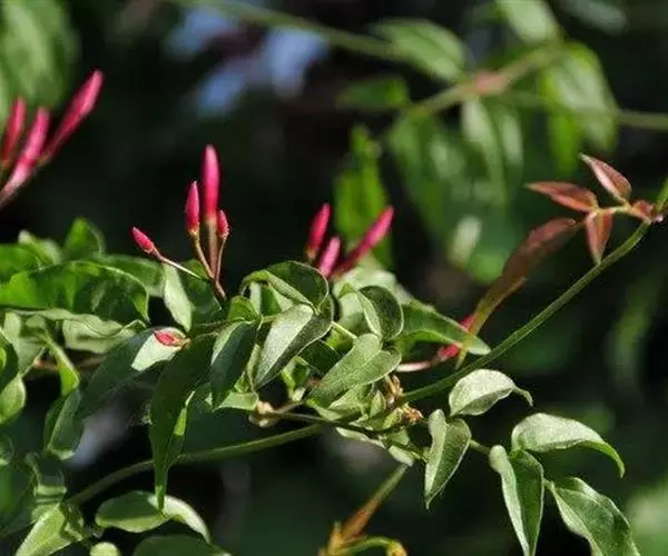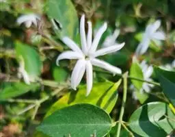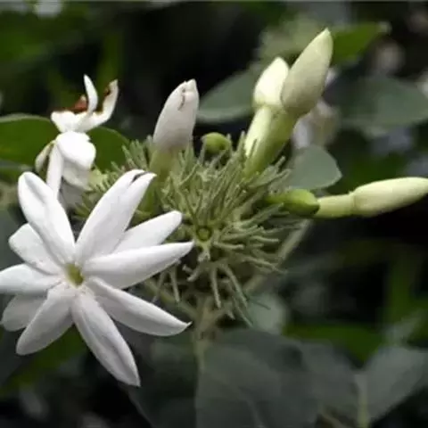 多花素馨是缠绕木质藤本植物,高1-10米。小枝圆柱形或具棱,无毛。叶对生,羽状深裂或为羽状复叶,有小叶5-7枚;叶柄长0.4-2厘米;叶片纸质或薄革质,两面无毛或下面脉腋间具黄色簇毛;顶生小叶片通常明显大于侧生小叶片,披针形或卵形,长(1.5-)2.5-9.5厘米,宽(0.6-)1-3.5厘米,先端锐尖至尾状渐尖,基部楔形或圆形,小叶柄长0-2厘米,侧生小叶片卵形或长卵形,长(1-)1.5-8.5厘米,宽(0.5-)1-2.7厘米,先端钝或锐尖,基部圆形、宽楔形或微心形,无柄或具短柄;小叶片具明显基出脉3条。