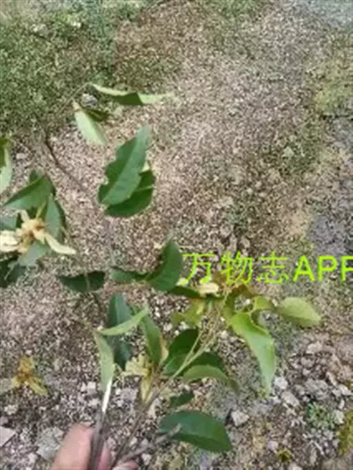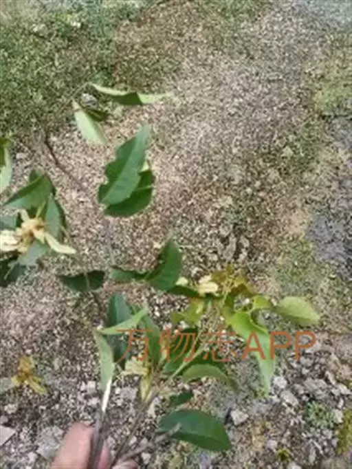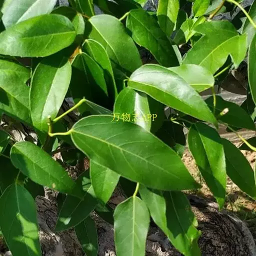 常绿乔木,常高10米,稀达20米。树皮灰色或深灰色,粗糙,裂成薄片脱落。小枝细瘦,近于圆柱形;当年生嫩枝紫色或紫绿色,近于无毛;多年生老枝褐色或深褐色。冬芽小,褐色,近于无毛。叶革质,长圆卵形,长5-7厘米,宽3-4厘米,全缘,基部钝形或近于圆形,先端渐尖或钝尖;下面有白粉;主脉在上面显著,在下面凸起,侧脉6-7对,基部的一对侧脉较长,其长度约为叶片的1/3-1/2,小叶脉显著,成网状;叶柄长2-3厘米,黄绿色,无毛。