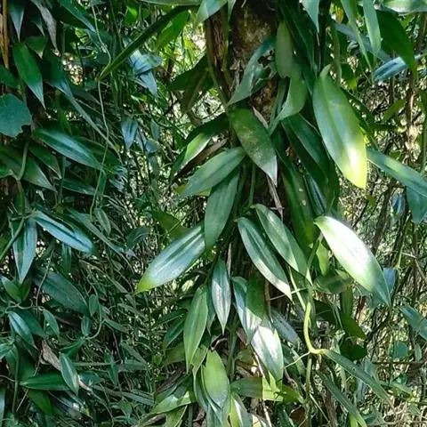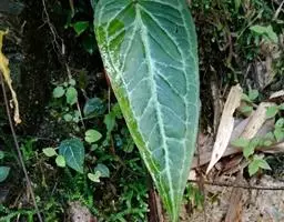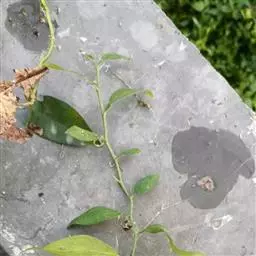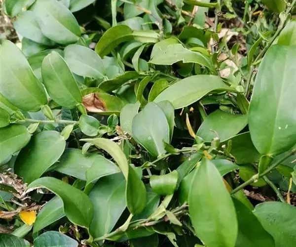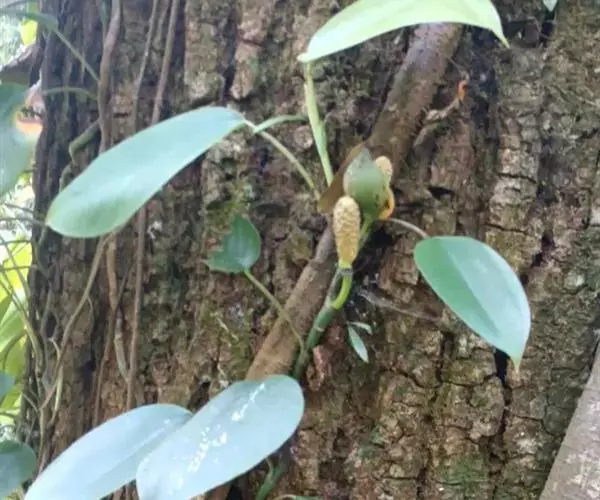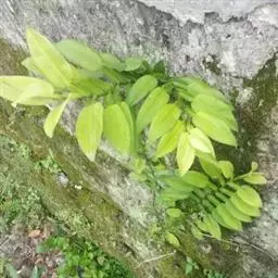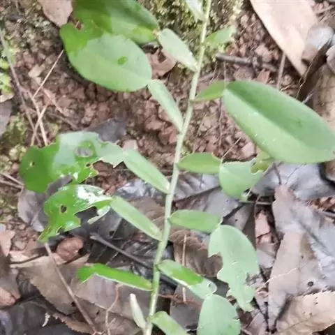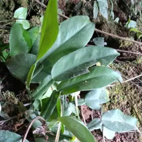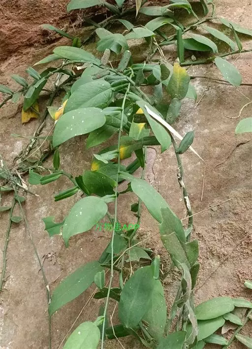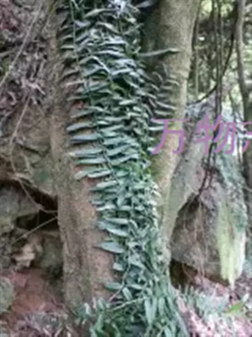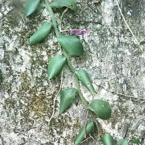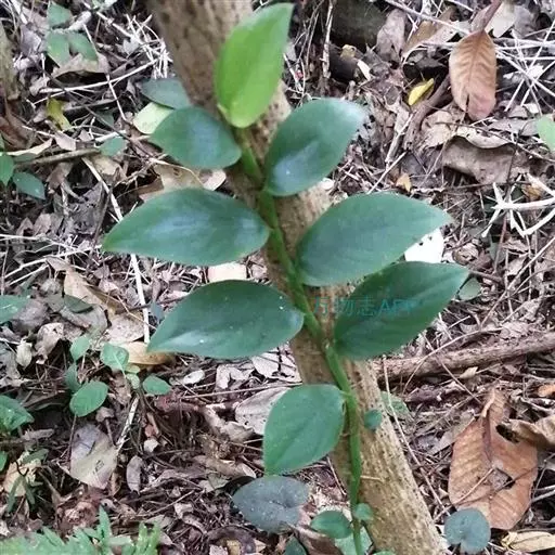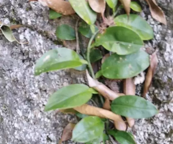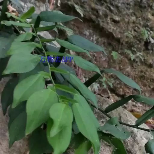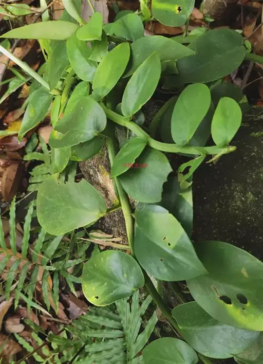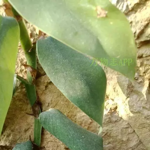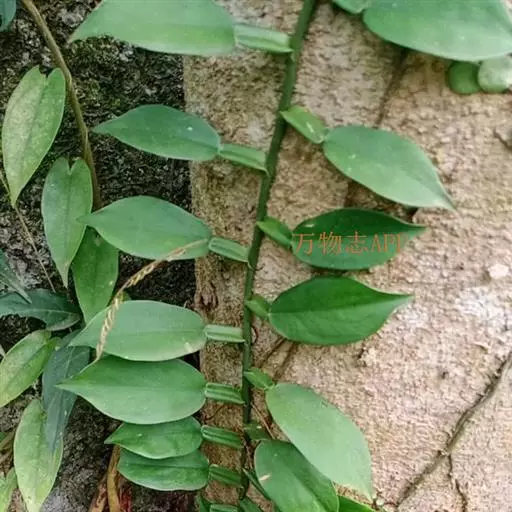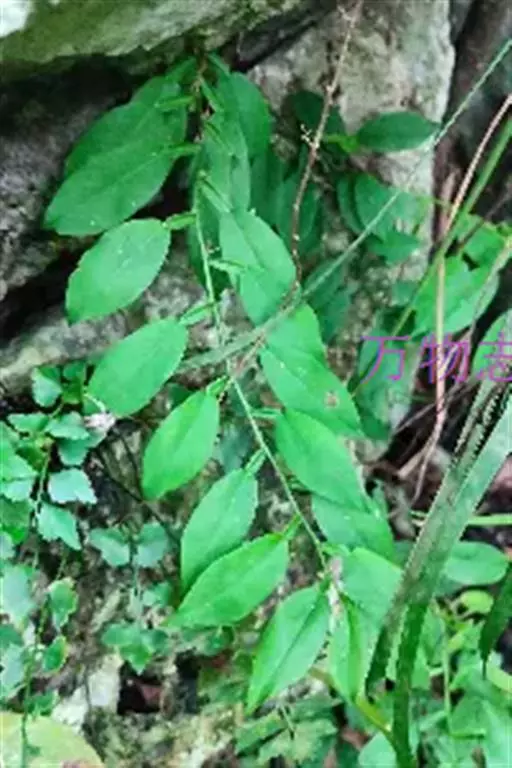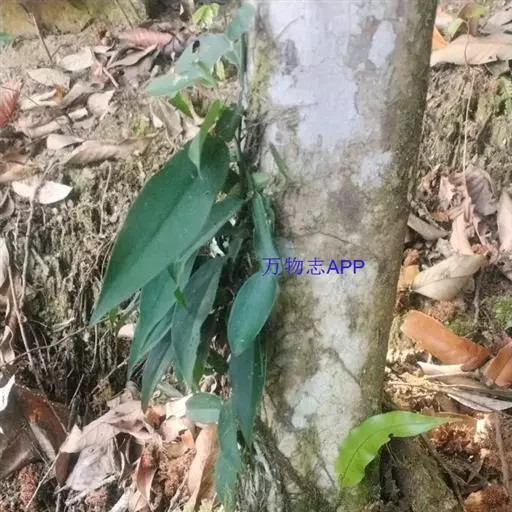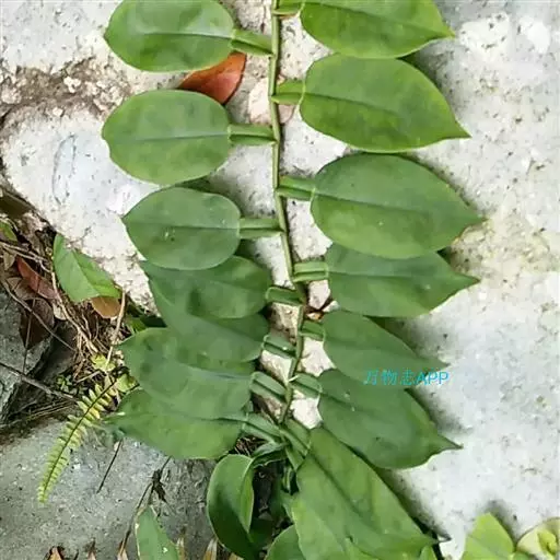 石柑子(Pothos chinensis (Raf.) Merr.):又名竹结草、爬山虎、巴岩香、百步藤。是单子叶植物纲、天南星科、石柑属附生藤本。茎亚木质,淡褐色,近圆柱形,具纵条纹,节上常束生长1-3厘米的气生根;分枝;叶片纸质,长6-13厘米,宽1.5 5-5.6厘米;中肋在表面稍下陷,背面隆起,侧脉4对;叶柄倒卵状长圆形或楔形,长1-4厘米,宽0.5-1.2厘米。花序腋生,基部具苞片4-5枚;苞片卵形,长5毫米;浆果黄绿色至红色,卵形或长圆形,长约1厘米。花果期四季。