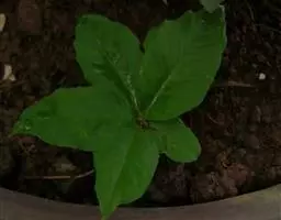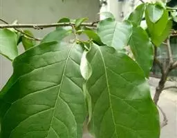 叶片纸质,鲜时表面深绿色,背面淡绿色,干后表面黄绿色,背面淡黄色,椭圆形,披针状卵形至披针状长圆形,长6-13厘米,宽1.5 5-5.6厘米,先端渐尖至长渐尖,常有芒状尖头,基部钝;中肋在表面稍下陷,背面隆起,侧脉4对,最下一对基出,弧形上升,细脉多数,近平行;叶柄倒卵状长圆形或楔形,长1-4厘米,宽0.5-1.2厘米,约为叶片大小的1/6。