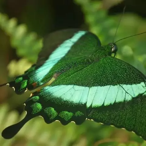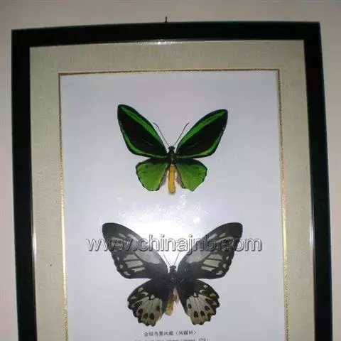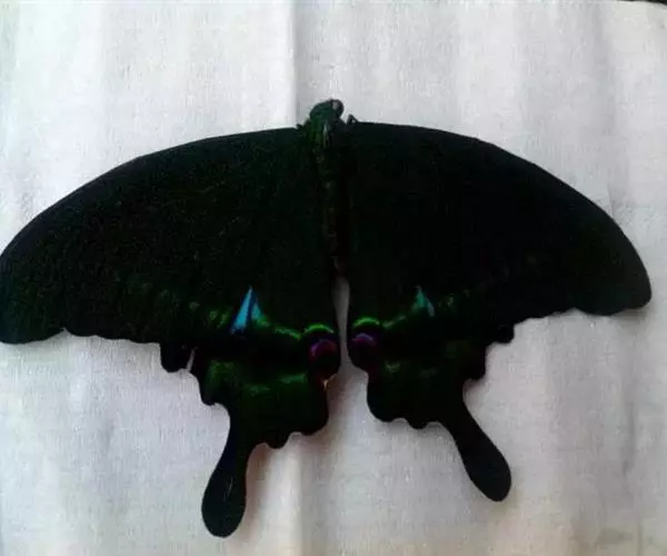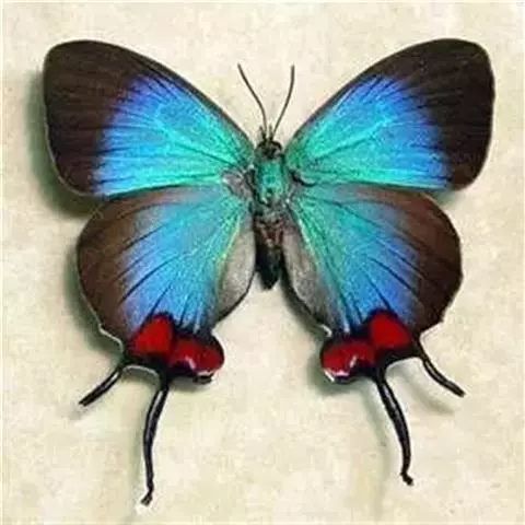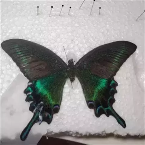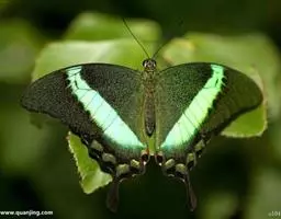 外观特征:展翅宽80~90mm。雄蝶下翅表面具1大块有强烈金属光泽的蓝绿色斑纹,雄蝶此斑纹上下呈细条状延伸。