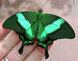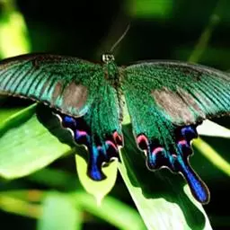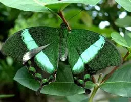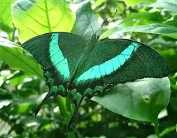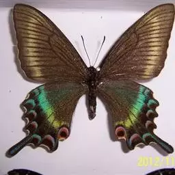 巴黎翠凤蝶中型凤蝶,躯体黑褐色,散布绿色亮鳞。后翅M3脉端有一明显叶状尾突。翅背面底色黑褐色,密布…
