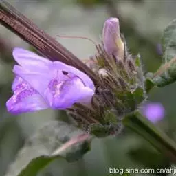 聚伞圆锥花序穗状,顶生,长14-18厘米,宽6-8厘米;花具梗,梗长5-8米米,密被短绒毛;苞片和小苞片微小;花萼5裂至下部,基部联合,裂片三角状披针形,长约5-7米米,密生微毛;花冠紫红色,长约5厘米,外密被倒生黄褐微毛和腺毛,花冠管长约4.2厘米,略向下弯,冠檐2唇形,上唇2裂,下唇3深裂;雄蕊2,着生近花冠管基部,稍外露,花药2室,背着生,椭圆形,花丝基部附近有2退化雄蕊的残迹。蒴果长,圆柱形,约3.5厘米,具10粒种子。