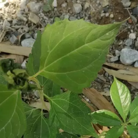 叶对生,有时上部的叶近互生,宽或长卵形,或三角状卵形,中部茎叶长2-6厘米,宽1.5-3.5厘米,或长宽相等。自中部向上及向下和腋生的叶渐小或小。全部叶有叶柄,柄长0.7-3厘米,边缘有规则的圆锯齿,齿大或小,或密或稀,顶端圆形或急尖,基部心形或平截,三出基脉或不明显五出脉,两面被稀疏或稠密的白色柔毛,下面及脉上的毛较密,上部叶的叶柄、腋生幼枝及幼枝叶的叶柄通常被开展的白色长绒毛。