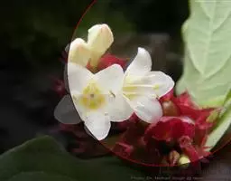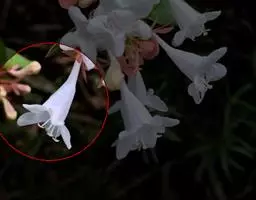花单生于小枝上叶腋,无总花梗;花梗长5-10毫米,被硬毛;小苞片三齿状,齿1长2短,花后不落;萼筒圆柱形,疏生短硬毛,萼齿4枚,狭椭圆形或倒卵状矩圆形,长约1厘米;花冠白色、淡黄色或带浅红色,狭漏斗形或高脚碟形,外面被短柔毛,杂有倒向硬毛,4裂,裂片圆形,筒为裂片长的三倍,内密生硬毛;雄蕊4枚,二强,着生于花冠筒中部,内藏,花药长卵圆形;子房3室,仅1室发育,花柱长约1厘米,柱头头状。果实具硬毛,冠以4枚宿存而略增大的萼裂片;种子圆柱形,长4-6毫米,具肉质胚乳。早春开花,8-9月结果。