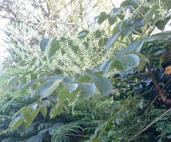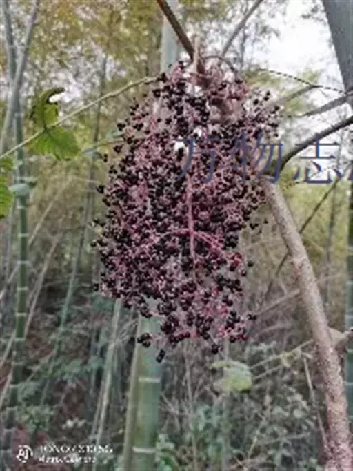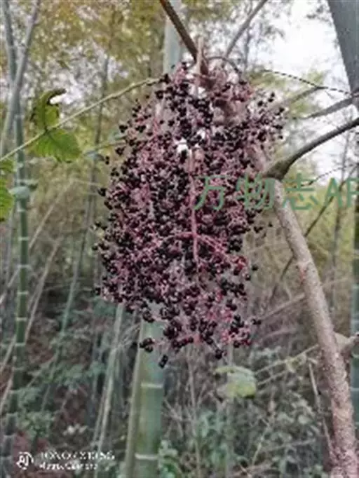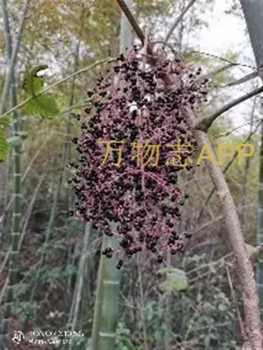 黄毛楤木 灌木,高1-5米;茎皮灰色,有纵纹和裂隙;新枝密生黄棕色绒毛,有刺;刺短而直,基部稍膨大。叶为二回羽状复叶,长达1.2米;叶柄粗壮,长20-40厘米,疏生细刺和黄棕色绒毛;托叶和叶柄基部合生,先端离生部分锥形,外面密生锈色绒毛;叶轴和羽片轴密生黄棕色绒毛;羽片有小叶7-13,基部有小叶1对;小叶片革质,卵形至长圆状卵形,长7-14厘米,宽4-10厘米,先端渐尖或尾尖,基部圆形,稀近心形,上面密生黄棕色绒毛,下面毛更密,边缘有细尖锯齿,侧脉6-8对,两面明显,网脉不明显;小叶无柄或有长达5毫米的柄,顶生小叶柄长达5厘米。圆锥花序大;分枝长达60厘米,密生黄棕色绒毛,疏生细刺;伞形花序直径约2.5厘米,有花30-50朵;总花梗长2-4厘米;苞片线形,长0.8-1.5厘米,外面密生绒毛;花梗长0.8-1.5厘米,密生细毛;小苞片长3-4毫米,宿存;花淡绿白色;萼无毛,长约2毫米,边缘有5小齿;花瓣卵状三角形,长约2毫米;雄蕊5,花药白色,花丝长2.5-3毫米;子房5室;花柱5,基部合生,上部离生。果实球形,黑色,有5稜,直径约4毫米。花期10月至次年1月,果期12月至次年2月。
