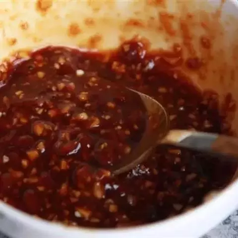 6、碗里准备好油辣椒或者辣椒酱,在5中的香料入锅炒变色后迅速捞起放入油辣椒搅拌匀。