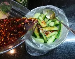 3、切些黄瓜段,调汁:红油4勺、白糖2勺、醋2勺、生抽2勺、花椒油2勺、黄酒1勺、芝麻2勺、香花生一小把、辣椒碎一勺、香葱末、姜末、味精1/4勺、盐3克,冰水1/4杯混和均匀;