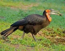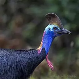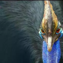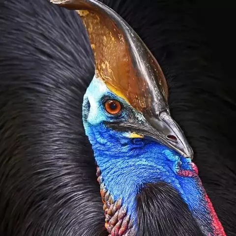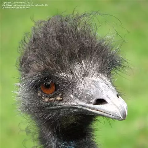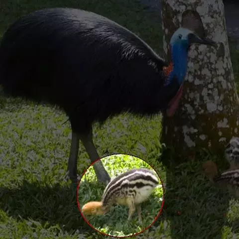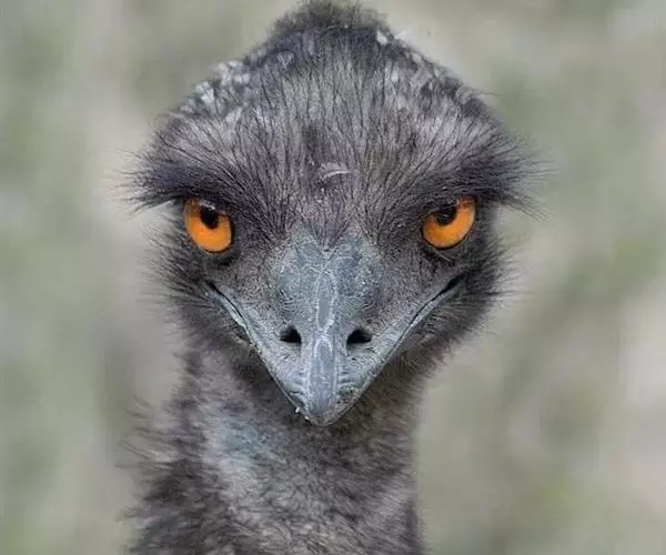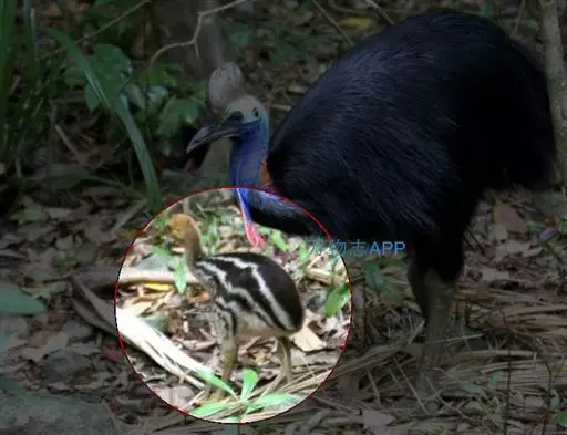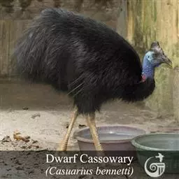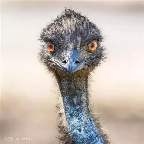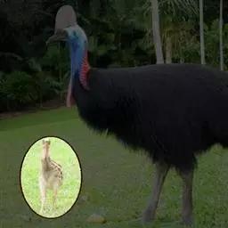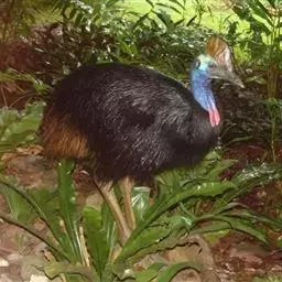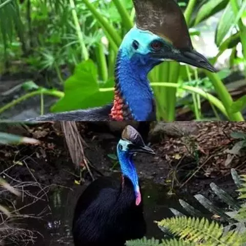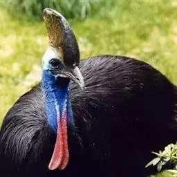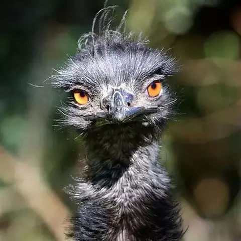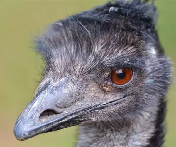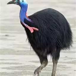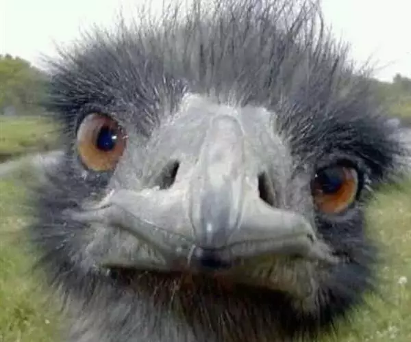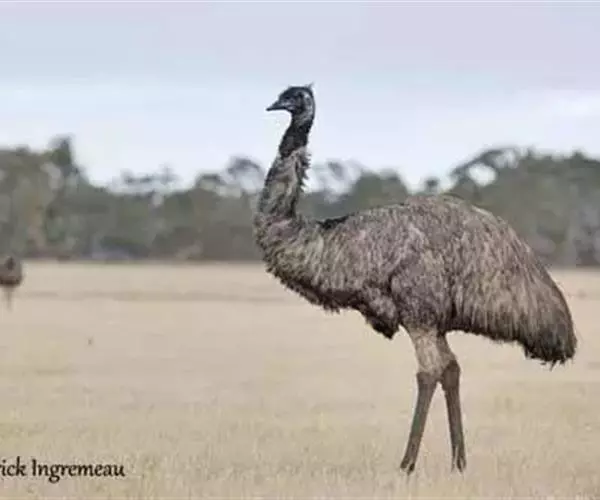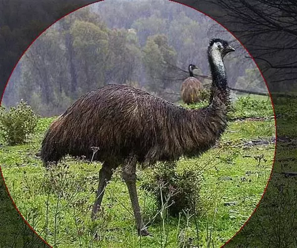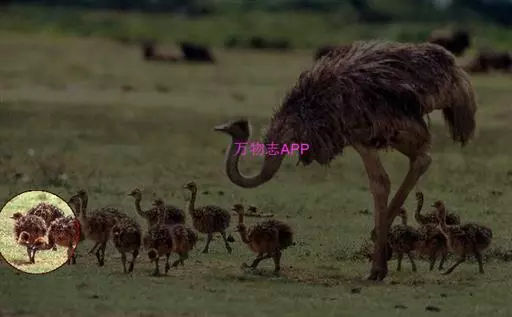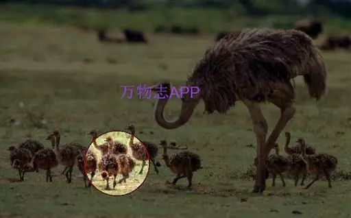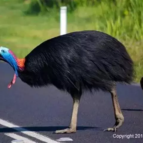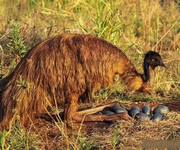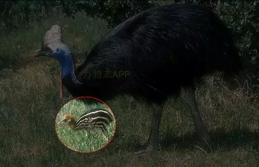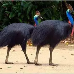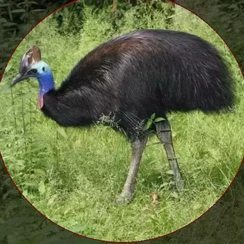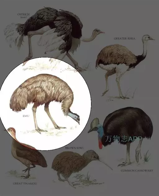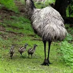鸸鹋,体高150-185厘米,体重30-45千克,寿命10年。成年雌性比雄性大。鸸鹋形似非洲鸵鸟而较小,属于平胸类,没有龙骨,嘴短而扁,羽毛灰色、褐色或黑色,长而卷曲自颈部向身体的两侧覆盖。翅膀退化,完全无法飞翔。足三趾,腿长善走。羽毛发育不全,具纤细垂羽,副羽甚发达,头、颈有羽毛、无肉垂。体健壮,腿长,同其亲属鹤鸵一样。两性体羽均为褐色,头和颈暗灰,颈部裸露的皮肤呈蓝色,喙为灰色,翅膀隐藏在残留的羽毛下,在炎热的天气,可以促进机体冷却。庞大的身体是由两个强大的灰色的三趾腿支撑。雏鸟有一个蓬松羽毛的头,身体由棕色和黑色条纹的羽毛组成。鸸鶓的跑速每小时可达50千米,被困时用三趾的大脚踢人。