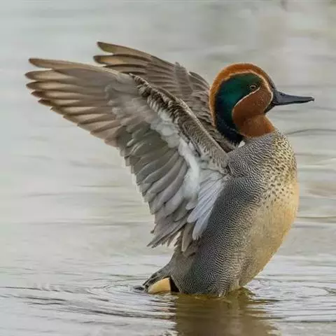 绿翅鸭是小型鸭类,体长37厘米,体重约0.5千克。嘴脚均为黑色。雄鸟头至颈部深栗色,…