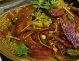 3.羊肉中有很多膜,切丝之前应先将其剔除,否则炒熟后肉膜硬,吃起来难以下咽。