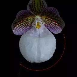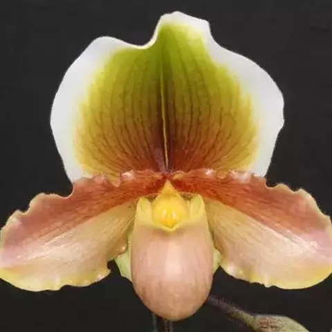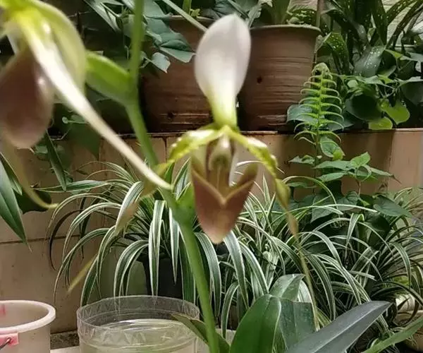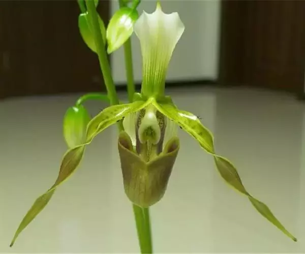 花葶近直立,长30-80厘米,绿色,无毛或较少略被短柔毛;总状花序具2-4花;花苞片宽卵形,长与宽各约长2厘米,先端钝并常有3小齿,近无毛;花梗和子房长达5.5厘米,无毛;花大;中萼片与合萼片白色而有绿色的基部和淡黄绿色脉,花瓣淡绿色或淡黄绿色并有深色条纹或褐红色晕,唇瓣绿黄色并有浅栗色晕,退化雄蕊淡绿黄色而有深绿色斑块;中萼片近椭圆形,长4-5.5厘米,宽1.8-2.5厘米,先端具短尖,边缘向后弯卷,内表面基部具短柔毛,背面中脉呈龙骨状突起;合萼片与中萼片相似,但稍宽而短,背面略有2条龙骨状突起;花瓣下垂,长带形,长8.5-12厘米,宽6-7毫米,扭曲,从中部至基部边缘波状,可见数个具毛的黑色疣状突起或长柔毛,有时疣状突起与长柔毛均不存在;唇瓣倒盔状,基部具宽阔的、长达2厘米的柄;囊近椭圆状圆锥形或卵状圆锥形,长2.5-3厘米,宽2-2.5厘米,囊口极宽阔,两侧各有1个直立的耳,两耳前方边缘不内折,囊底有毛;退化雄蕊倒心形或倒卵形,长1-1.2厘米,宽8-9毫米,先端有弯缺,上面基部有1个角状突起,沿突起至蕊柱有微柔毛,背面有龙骨状突起,边缘具细缘毛。