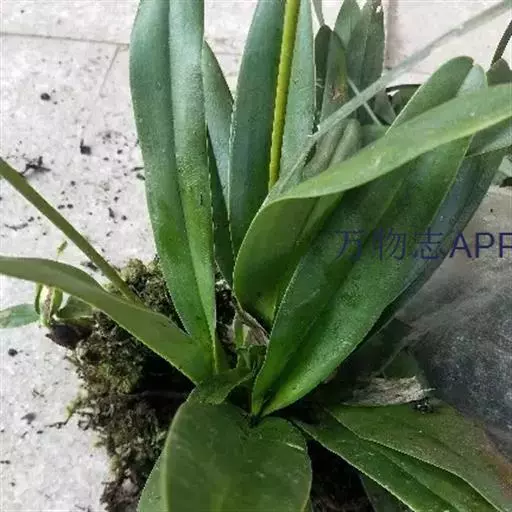 附生植物,较高大。叶基生,二列,2-5枚;叶片宽带形或舌状,厚革质,干后常呈棕红色,长15-30厘米,宽3-5厘米,先端近浑圆并有裂口或小弯缺,背面中脉呈龙骨状突起,无毛,基部收狭成叶柄状并对折而彼此套叠,长度一般可达6-7厘米。