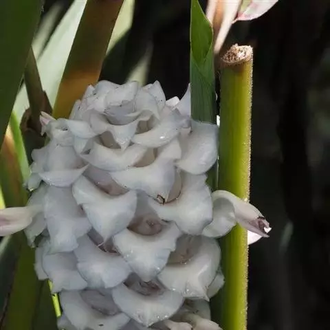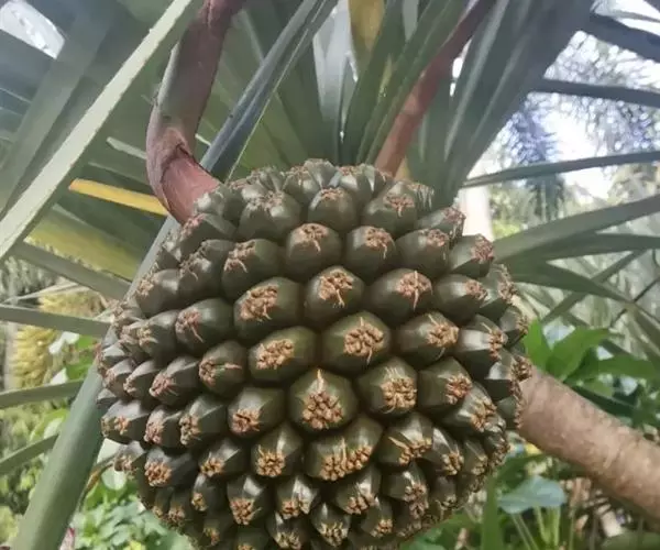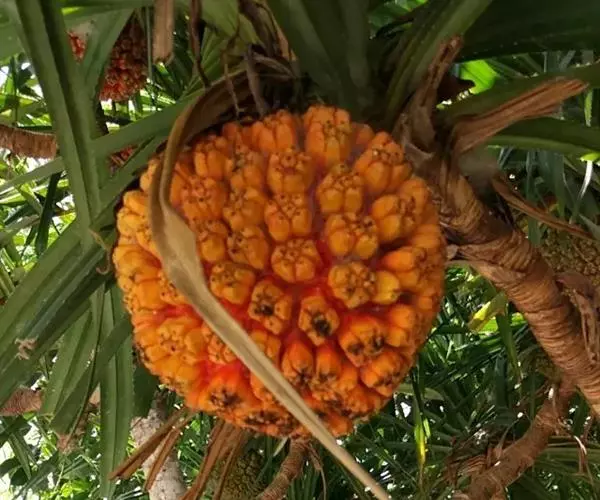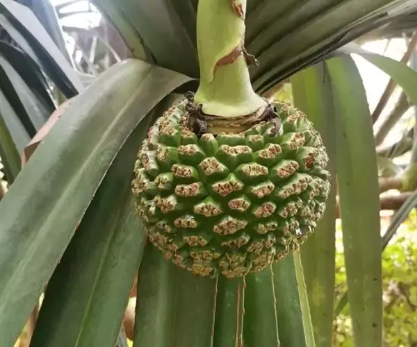 雄花序由若干穗状花序组成,每一穗状花序长约5厘米;佛焰苞长披针形,长10-26厘米,宽1.5-4厘米,近白色,先端渐尖,边缘和背面隆起的中脉上具细锯齿;雄花芳香,雄蕊常为10余枚,多可达25枚,着生于长达9毫米的花丝束上,呈总状排列,分离花丝长约1毫米,花药条形,长3毫米,宽0.6毫米,基着药,药基心形,药隔顶端延长的小尖头长1-1.5毫米;雌花序头状,单生于枝顶,圆球形;佛焰苞多枚,乳白色,长15-30厘米,宽1.4-2.5厘米,边缘具疏密相间的细锯齿,心皮5-12枚合为一束,中下部联合,上部分离,子房上位,5-12室,每室有1颗胚珠。聚花果大,向下悬垂,由40-80个核果束组成,圆球形或长圆形,长达17厘米,直径约15厘米,幼果绿色,成熟时桔红色;核果束倒圆锥形,高约5厘米,直径约3厘米,宿存柱头稍凸起呈乳头状、耳状或马蹄状。花期1-5月。