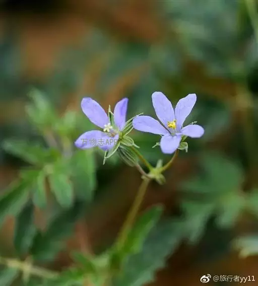 一年生草本,高7-15厘米,全株被灰白色柔毛。茎仰卧或基部仰卧,下部多分枝。叶对生;托叶钻状,长约2毫米,被短柔毛;基生叶和茎下部叶具长柄,柄长5-6厘米;叶片长卵形或三角状卵形,长15-25毫米,宽10-15毫米,不分裂,边缘具不整齐的圆齿,或通常3深裂,中裂片较大,长卵形,边缘具浅裂状圆齿,侧裂片较小,边缘为不规则圆齿,表面密被短柔毛,背面被短绒毛;茎上部叶柄较短,叶片较小,裂片有时全缘。总花梗腋生或顶生,长2-3厘米,密被短绒毛,每梗具2花或有时1-3花;花梗与总花梗相似,长为总花梗的1半或近等长;萼片椭圆形或椭圆状卵形,长5-6毫米,先端圆形,具短尖头,背面密被短柔毛;花瓣紫红色,倒卵形,与萼片近等长;雄蕊中部以下扩展。蒴果椭圆形,长5-6毫米,宽3-4毫米,被开展或稍向上的长柔毛,上部通常具横沟纹;喙长达7-9厘米,易脱落,成熟裂开后呈羽毛状。花期4-5月,果期5-6月。