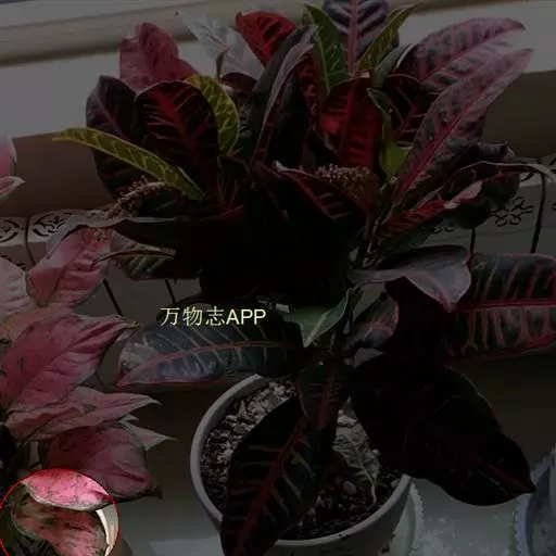 大叶种,叶中心为乳白色,叶缘绿色,主脉白色,叶面嵌有深红斑块;