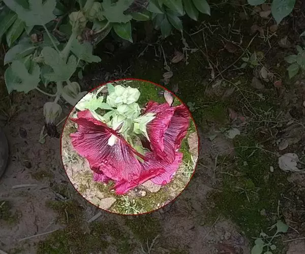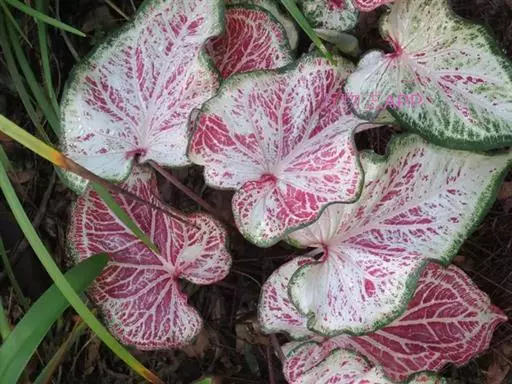 叶玫瑰红色,中心深紫红色,周围具白色斑纹,主脉红色。