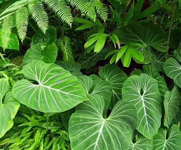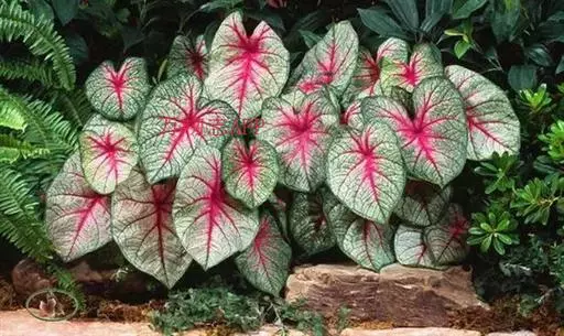 五彩芋叶子十分的翠绿,叶子中间会有红色的叶子向间、耀眼的白斑点呈现在翠绿之上似锦如霞,五彩芋加上白叶绿脉、红叶白脉相互搭配,给人更加艳丽夺目、高贵典雅的感觉。而彩叶芋经常给作为室内盆栽植物,通常都是放置在桌上或者是窗台,显得更为雅致和典雅。特别是放在落地窗那里,更有一番风景,或者是庭园栽植,亦可切花作花材和其他花卉搭配成花束。当人们劳累了一天的时候,回家看到自己家里的五彩芋生长的如此的有生命力,能给你带来欢喜、愉快的感觉。所以,它的花语为喜欢、欢喜、愉快。