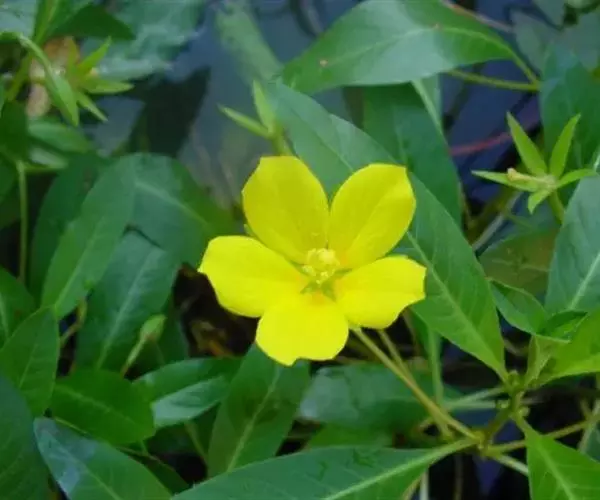 黄花水龙是生长在浅水 黄花水龙 的多年生浮叶植物,长可达5公尺,以不定芽繁殖。具匍匐茎或浮生茎,整株蔓生或挺立生长,整株无毛,茎中空,节间簇生白色气囊(气生根)。叶互生,长椭圆形,叶托大。花开于枝顶,腋生,萼片5枚,呈三角形,长6-12mm,花瓣5枚,金黄色,长9-17mm,雄蕊10。不结实。主要生分布於河川流水域边或低洼湿地。黄花水龙是多年生挺水型草本植物,花开在枝顶,呈黄色。城区河道种植的黄花水龙整朵花直径在5厘米左右,开花时间为每年5—6月。