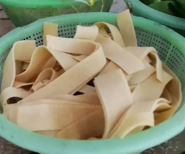 (2)到将鱼胶、腊肠、肥猪肉、鸡蛋白、精盐、味精放进豆腐盆内,用手搅拌均匀。再加入葱白、方鱼末、生粉、澄面粉、胡椒粉、麻油,再搅拌均匀。取4张薄保鲜纸,每张20厘米X 20厘米,抹上生油,把已调好味的豆腐泥分成4份,分别放在已抹油的保鲜纸上抹平,抹成日字形薄状,包起放进电冰箱冻至稍变硬。