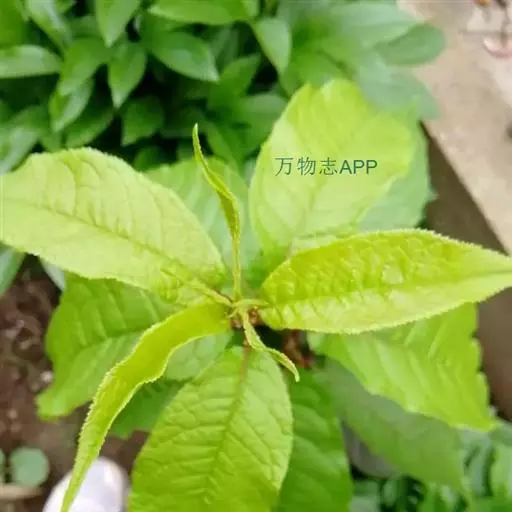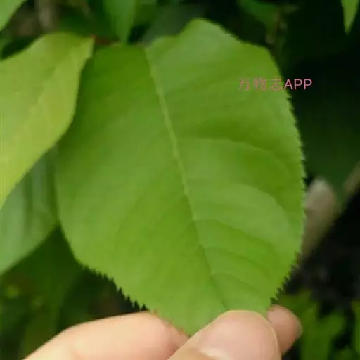 叶片椭圆形、长圆形或长圆倒卵形,长4-10厘米,宽2-4.5厘米,先端尾尖,基部圆形或宽楔形,边缘有不规则锐锯齿,有时混有重锯齿,上面深绿色,下面淡绿色,两面无毛;下面中脉和侧脉均突起;叶柄长1-1.5厘米,幼时被短绒毛,以后脱落近无毛,顶端两侧各具1腺体;托叶膜质,线形,先端渐尖,边有带腺锯齿,早落。