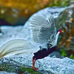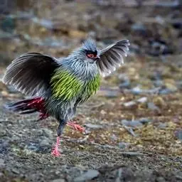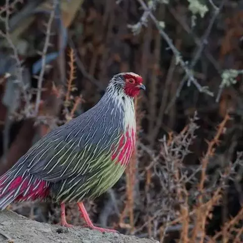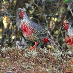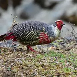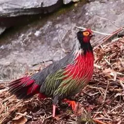 血雉雉科血雉属鸟类,别名血鸡、松花鸡,血雉的雄鸟大覆羽、尾下覆羽、尾上覆羽、脚、头侧、腊膜为红色,…