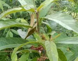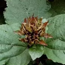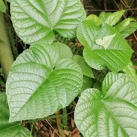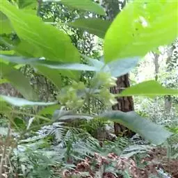 叶片宽卵形或近于心形,长9-22厘米,宽8-21厘米,顶端渐尖,基部截形,宽楔形或浅心形,边缘疏生粗齿,表面密被刚伏毛,背面密被柔毛,沿脉更密或有时两面毛较少,基部三出脉,脉腋有数个盘状腺体,叶片揉之有臭味;叶柄长3-17厘米,被短柔毛,有时密似绒毛。