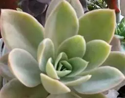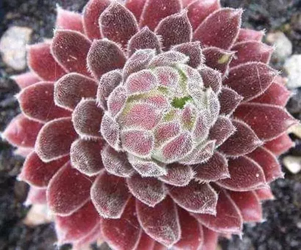 植株莲座形,莲座叶盘很小,但易群生呈垫状生长,因此在原产地每株占地面积较大。叶排列紧密,绿色中带红色,叶尖有白毛,在植株顶部联结如蛛网。叶元柄,倒卵形;粉红花,直径2厘米左右。