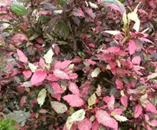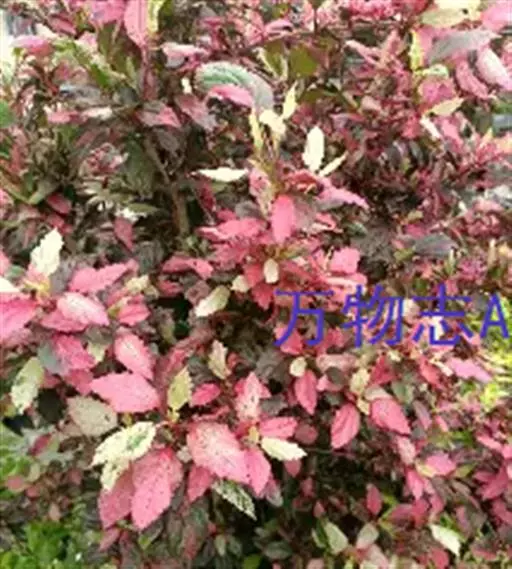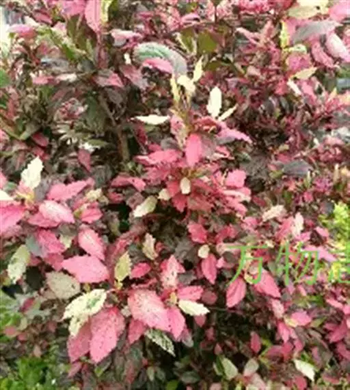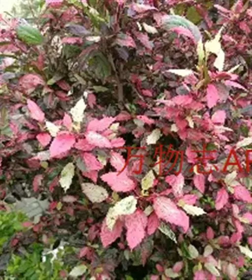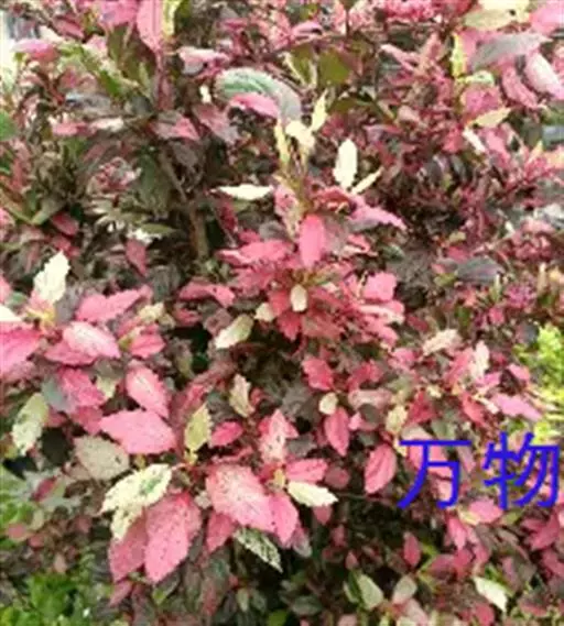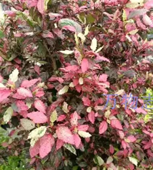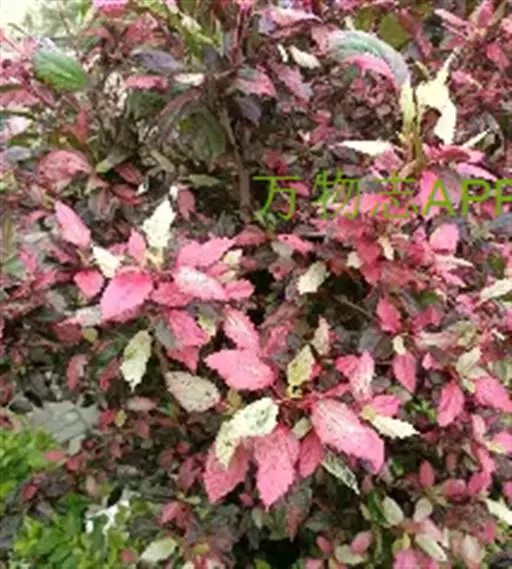 落叶或常绿灌木,株高1~2米,小枝赤红色,叶长卵形或卷曲缺裂,叶片有白、红、淡红、黄、淡绿等不规则斑纹,花小,朱红色。花期长。蒴果卵圆形。