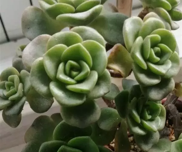 百合莉莉易长侧芽,底部叶片易枯萎形成多头老桩,叶片肥厚圆匙状,叶尖不明显,莲花状紧密排列,随养护环境同,叶色绿色到粉橙绿色,出状态的百合莉莉非常好看,但变绿的百合莉莉就有点一脸菜色了。百合莉莉的另一亮点是香气明显,小老桩非常漂亮。