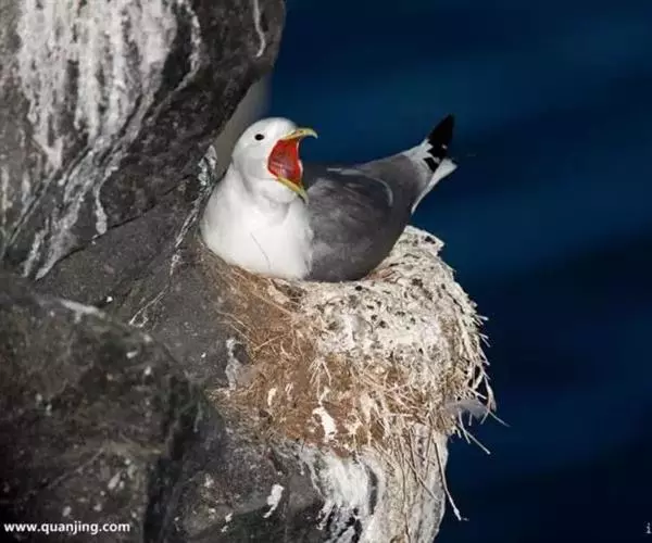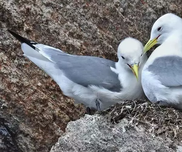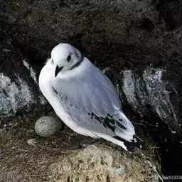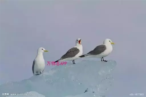 三趾鸥(学名:Rissa tridactyla),中型水鸟,体长38-47厘米。夏羽头、颈和翕前部白色。背、翅上覆羽和腰灰色。肩灰色,羽缘和尖端白色。尾上覆羽和尾白色。冬羽和夏羽基本相似,但头顶和枕淡灰色,头顶有不明显的灰色纵纹。后颈和翕前部灰色,带有暗色羽尖。常成群活动。主要以小鱼为食。有时也吃甲壳类和软体动物。觅食主要在海面涡流中捕食。也可在飞翔中或是游泳觅食。营巢于海岸和海岛上。常成群在一起繁殖。繁殖群从几对到数百对,通常营巢于岛屿或岸边悬岩和岩石上。营巢位置较为固定,老鸟常常回到同一地方营巢。雌雄共同营巢。巢主要由枯草、枯枝构成,内垫有羽毛。