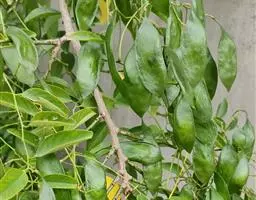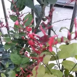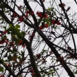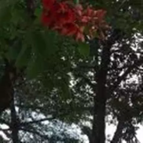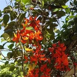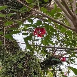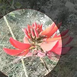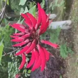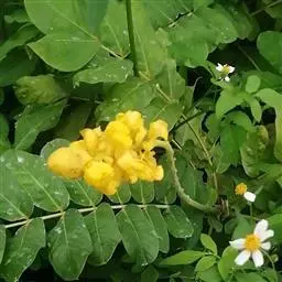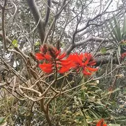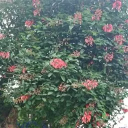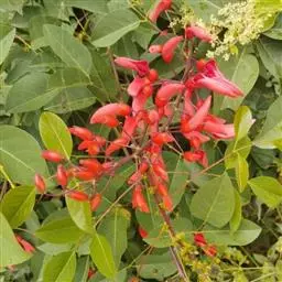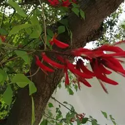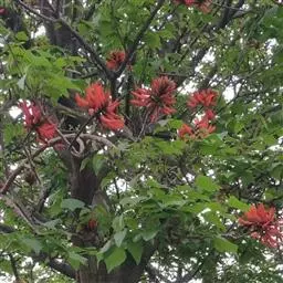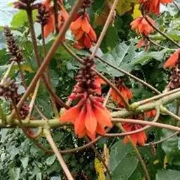 龙牙花(学名:Erythrina corallodendron L.):是一种灌木或落叶小乔木植物,高约3-15米,树冠阔度可达3.5米。树皮粗糙,灰褐色;树干及枝条疏生粗壮的黑色瘤状皮刺,老枝无刺。叶为三出羽状复叶,互生;叶柄无毛,淡红色,有时上和下面中脉上疏生倒钩状小皮刺,长约6-12厘米;顶生小叶较侧生小叶为大,侧生小叶基部略偏斜;小叶菱状卵形或菱形,顶端尾状或渐尖而钝,基部宽楔形或近截形或近圆形,基部有一对腺体,全缘,两面无毛,有时背面的中脉上具小皮刺,长约4-10厘米,宽约2.5-8厘米;小叶柄无毛及中脉上有刺,长约3-5毫米;小托叶腺体状。