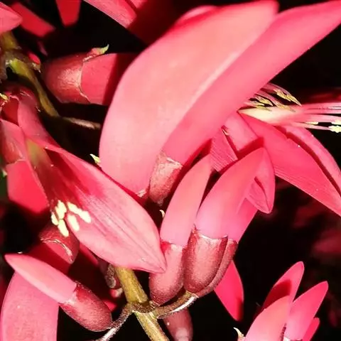 总状花序腋生,长可达30厘米以上;花深红色,具短梗,与花序轴成直角或稍下弯,长4-6厘米,狭而近闭合;花萼钟状,萼齿不明显,仅下面一枚稍突出;旗瓣长椭圆形,长约4.2厘米,先端微缺,略具瓣柄至近无柄,翼瓣短,长1.4厘米,龙骨瓣长2.2厘米,均无瓣柄;雄蕊二体,不整齐,略短于旗瓣;子房有长子房柄,被白色短柔毛,花柱无毛。
