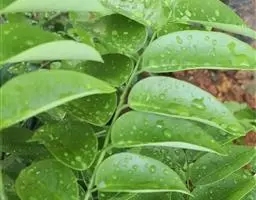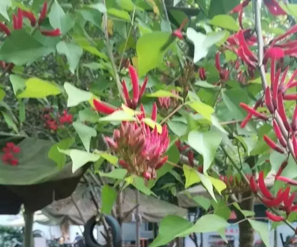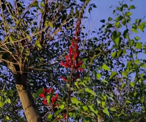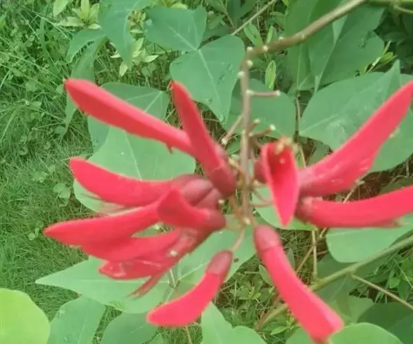 龙牙花是灌木或小乔木植物,高3-5米。干和枝条散生皮刺。羽状复叶具3小叶;小叶菱状卵形,长4-10厘米,宽2.5-7厘米,先端渐尖而钝或尾状,基部宽楔形,两面无毛,有时叶柄上和下面中脉上有刺。