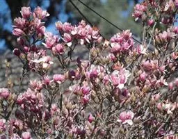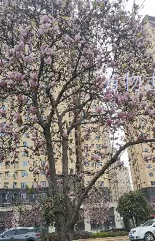 ‘紫嫣’玉兰(Magnolia soulangiana ‘ZiYan’)。二乔玉兰品种,落叶小乔木或灌木,株型紧凑,分枝密集。花桃红色,瓣顶色略浅,内面白色,盛开时花被片直立。花被片9,内外几同形。花期4月。果未见。