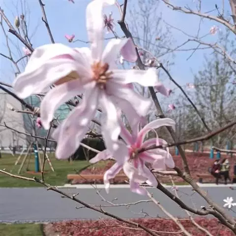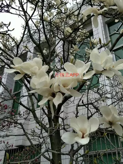 ‘大花’白玉兰(Magnolia denudata‘DaHua’)。落叶乔木。花白色,基部淡红色或向上延伸成红色脉纹,盛开时花被片近平展,略外卷。花被片9枚,内外几同形或外轮花被片线状。花期3月,果熟期8月。叶色浓绿,落叶期比其他白玉兰晚0.5-1个月。