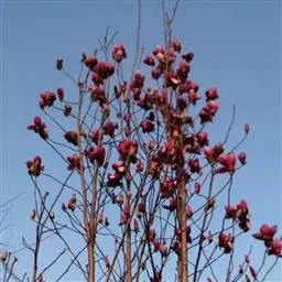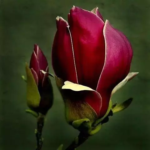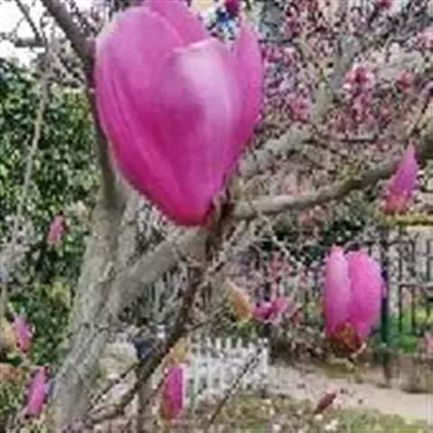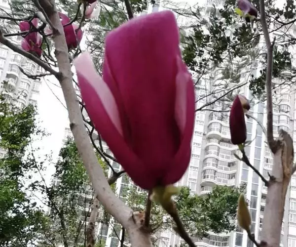 ‘林奈’玉兰(Magnolia soulangiana ‘Lennei’)。二乔玉兰品种,落叶大灌木,树枝略凌乱。花紫红色,花被片9枚,外轮略小,有时大萼片状。花碗状,径可达12-25厘米。花期4-5月,比其他二乔玉兰晚,7-9月可零星开花。果期9月。