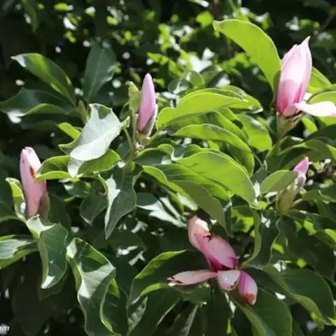 ‘红玉’玉兰(Magnolia ‘HongYu’)。玉灯玉兰和青皮玉兰的杂交品种。落叶小乔木,速生。花粉红色,基部桃红色,内轮颜色渐深。花被片12-16枚,内外几同形,径15-20厘米。花初开时灯泡状,盛开时莲花状。花期3月上旬,夏秋季会零星开花,花色较春季略淡。果少见。