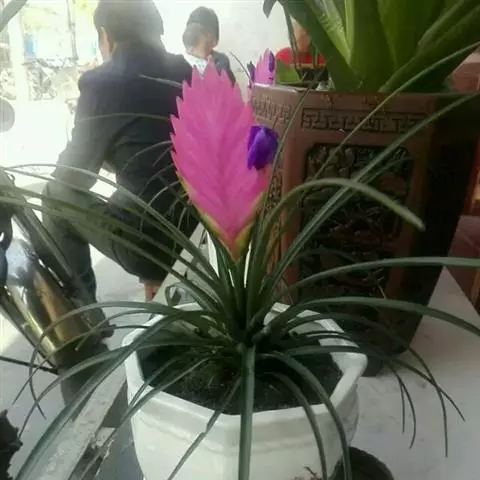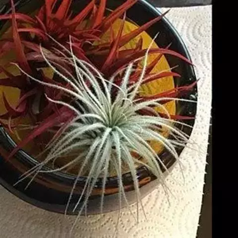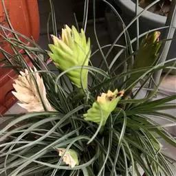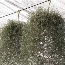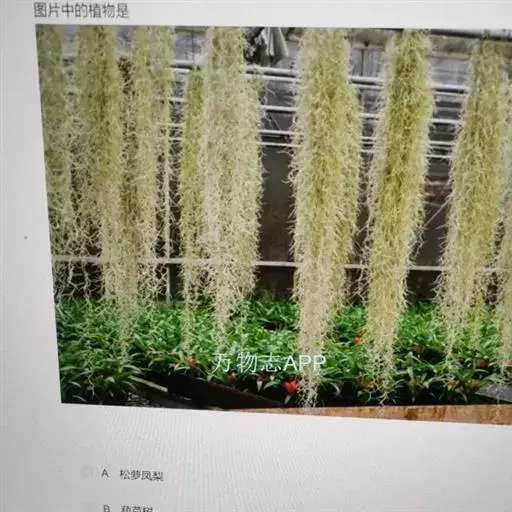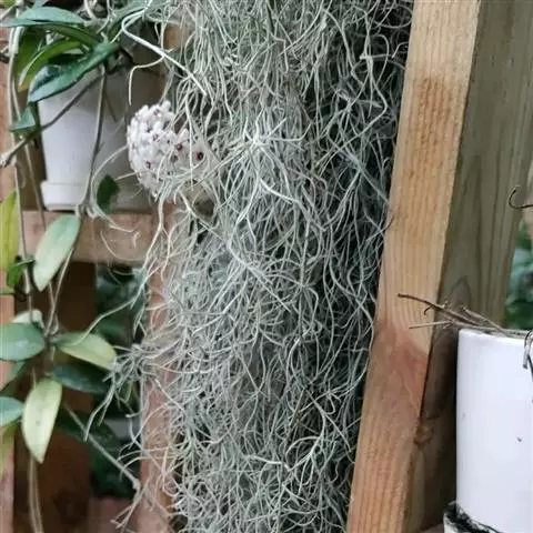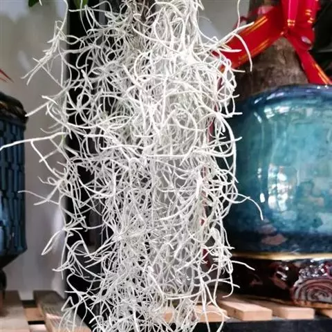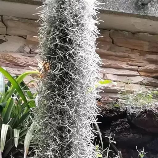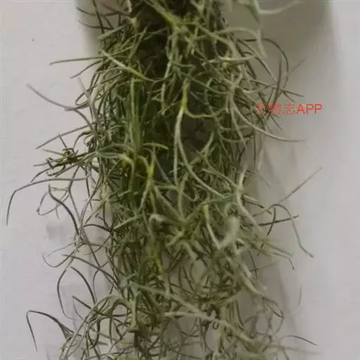 松萝铁兰也叫松萝凤梨,是凤梨科铁兰属,草本植物,植株下垂生长,茎长,纤细;叶片互生,半圆形,长3~4cm,密被银灰色鳞片;小花腋生,黄绿色,花萼紫色,小苞片褐色,花芳香。外形似地衣类的松萝。原产美国南部、阿根廷中部,中、南美洲广布。