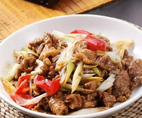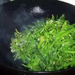5、加入洋葱、尖椒、青蒜炒至断青。