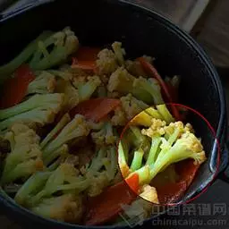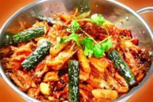 3、支炒锅,下适量辣椒油和色拉油的混合油(比例是1/4),下八角、桂皮、草果、白蔻、花椒炸香后捞出,然后下豆瓣、葱、姜、蒜,依次下炸熟的虾、土豆(红薯)、冬笋(花菜)、黄瓜、西芹来回翻炒。