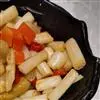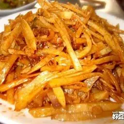 1、把上好土豆(红薯)去皮洗净切条儿,用色拉油炸熟后备用,上等冬笋(或煮熟的花菜也可)黄瓜切条备用,西芹切条,大葱 切段儿,生姜大蒜仔切片各少许即可,小葱切花放一边备用。