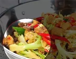 待炒上几番 以后,配料差不多熟了,下蟹酱,然后下少许味精、鸡精、白糖,继续翻炒。