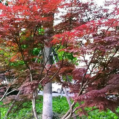 红枫,园艺种,槭树科槭属落叶小乔木,高5~8 m;树冠伞形,枝条开张,细弱。单叶对生,近圆形,薄纸质,…