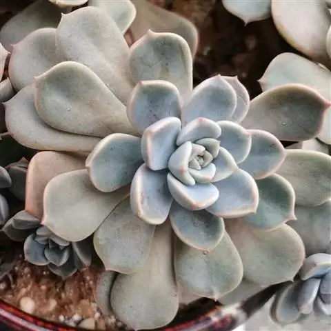 大和锦是景天科拟石莲花属的多肉植物。肉质叶排成紧密的莲座状,广卵形至散三角卵形,背面突起呈龙骨状,…