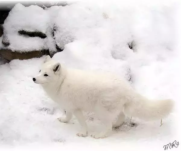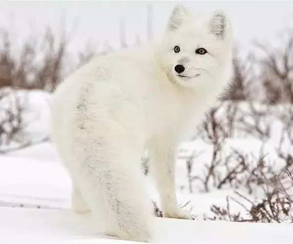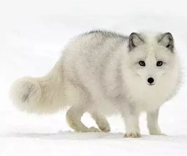 北极狐(学名:Vulpes lagopus):体长50-60厘米,尾长20-25厘米,体重2.5-4千克。颜面窄,嘴尖,耳圆,尾毛蓬松,尖端白色。冬季全身体毛为白色,仅鼻尖为黑色;夏季体毛为灰黑色,腹面颜色较浅。具有很密的绒毛和较少的针毛,可在零下50℃的冰原上生活。足底毛特别厚。