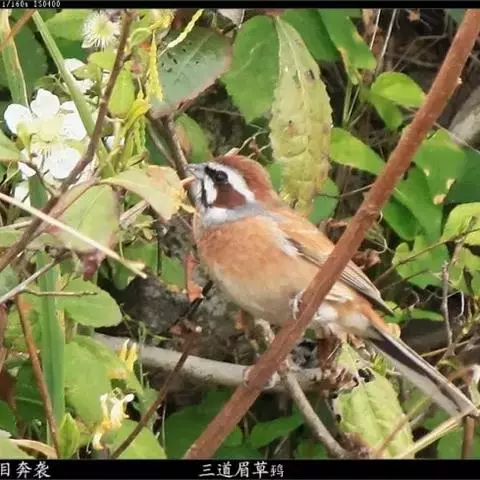 三道眉草鹀(学名:Emberiza cioides)共有五个亚种,体长约16厘米,是一种棕色鹀。具醒目的黑白色头部图纹和栗色的胸带,以及白色的眉纹。繁殖期雄鸟脸部有别致的褐色及黑白色图纹,胸栗,腰棕。雌鸟色较淡,眉纹及下颊纹黄色,胸浓黄色。三道眉草鹀的冬春季食谱以野生草种为主,夏季以昆虫为主。喜欢在开阔地环境中活动,见于丘陵地带和半山区地稀疏阔叶林地,山麓平原或山沟的灌丛和草丛中以及远离村庄的树丛和农田。主要分布在亚洲东部地区,俄罗斯的远东地区、蒙古国、朝鲜半岛、日本列岛和中国。
