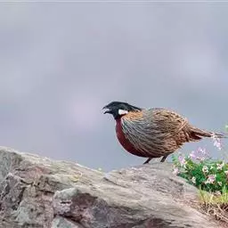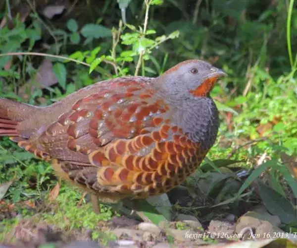 灰胸竹鸡 雄鸟额与眉纹灰色,有时额不为灰色而与头顶同色。眉纹粗著而长,向后一直延伸至上背。头顶和后颈橄榄褐色,具不甚明显的暗褐色纹。上背灰褐色,具不甚清晰的暗褐色虫蠹状斑和栗红色块斑;颊、耳羽及颈侧栗棕色;肩和下背橄榄褐色,密布黑色虫蠹状斑,并具有栗红色块斑和白色斑点。腰、尾上覆羽、翅上大覆羽和中覆羽以及三级飞羽橄榄褐色,密布黑色虫蠹状斑;腰和尾上覆羽末端中部缀一细的黑褐色点斑,有的点斑前部为淡栗色,后部为黑色;三级飞羽和大、中覆羽端部缀有棕黄色与栗色斑;大覆羽并具棕色端斑。初级飞羽、初级覆羽和次级飞羽暗褐色,初级飞羽外翈基部棕色,杂有黑色斑点;次级飞羽末端和外翈边缘淡棕色,具橄榄褐色斑点。中央尾羽红棕色,密杂以黑褐色和淡褐色虫蠹状横斑,外侧尾羽几纯红综色。头、颈两侧,以及颏、喉栗红色,前胸蓝灰色,向上伸至两肩和上背,形成环状,环后紧缘以栗红色,后胸、腹和尾下覆羽棕黄色 灰胸竹鸡 。两胁缀有黑褐色点斑或横斑。雌鸟和雄鸟相似,但稍小,且跗蹠无距。虹膜深棕色或淡褐色。嘴黑色,跗蹠和趾绿色或黄褐色。